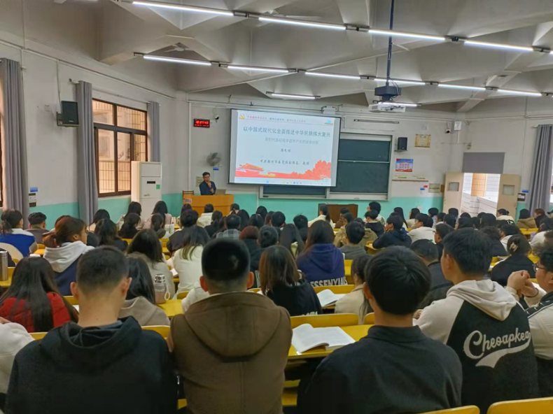 思政课教师代表及2022级汉语国际教育、行政管理、数字艺术和英语专业近600名师生以线上线下相结合的方式聆听了“以中国式现代化全面推进中华民族伟大复兴”的专题授课。