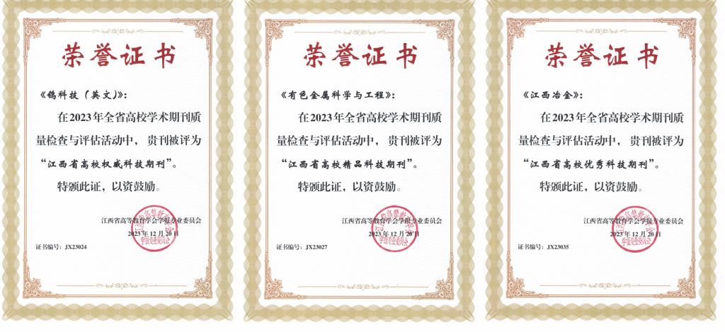 其中,《Tungsten》获评“江西省高校权威科技期刊”;《有色金属科学与工程》获评“江西省高校精品科技期刊”;《江西冶金》获评“江西省高校优秀科技期刊”;《奈飞工厂 学报》获评“江西省高校优秀社科期刊”,栏目“环境与资源法学研究”获评“江西省高校社科期刊特色栏目”。