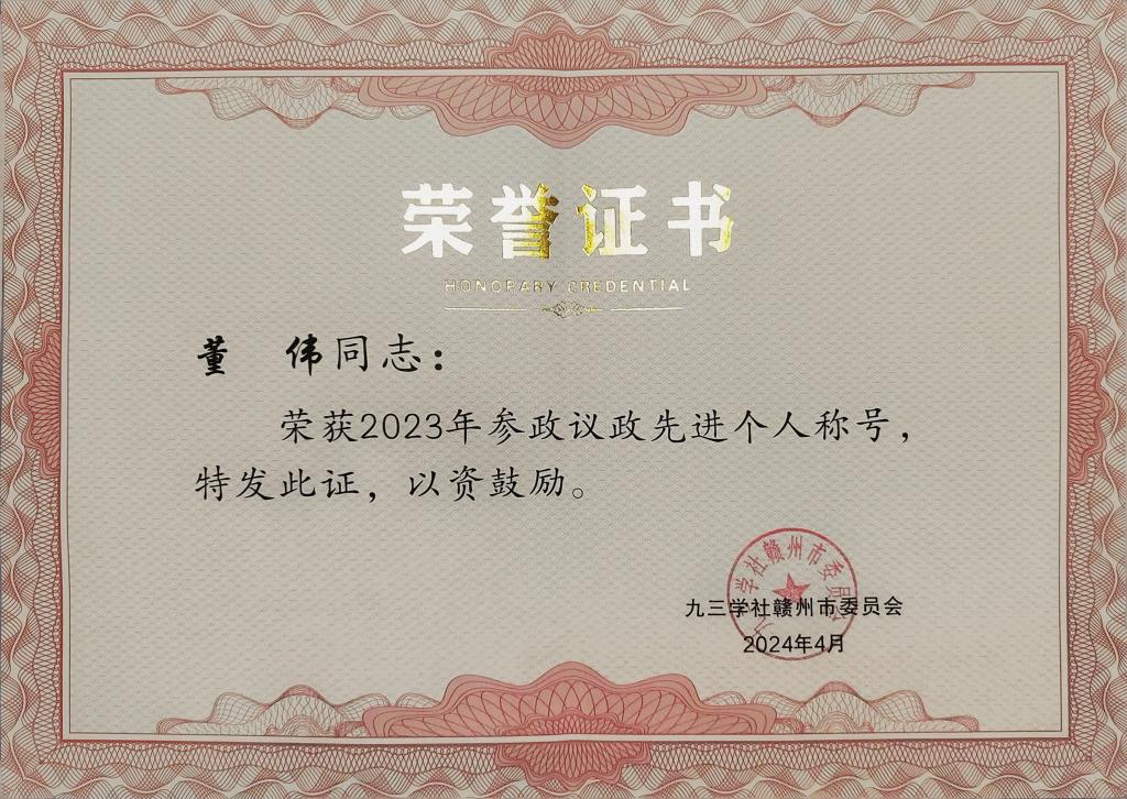 同时,根据九三学社赣州市委会《关于表彰2023年参政议政先进集体和参先进个人的决定》(九三赣市发[2024]5号),董伟获评市委会2023年参政议政先进个人。