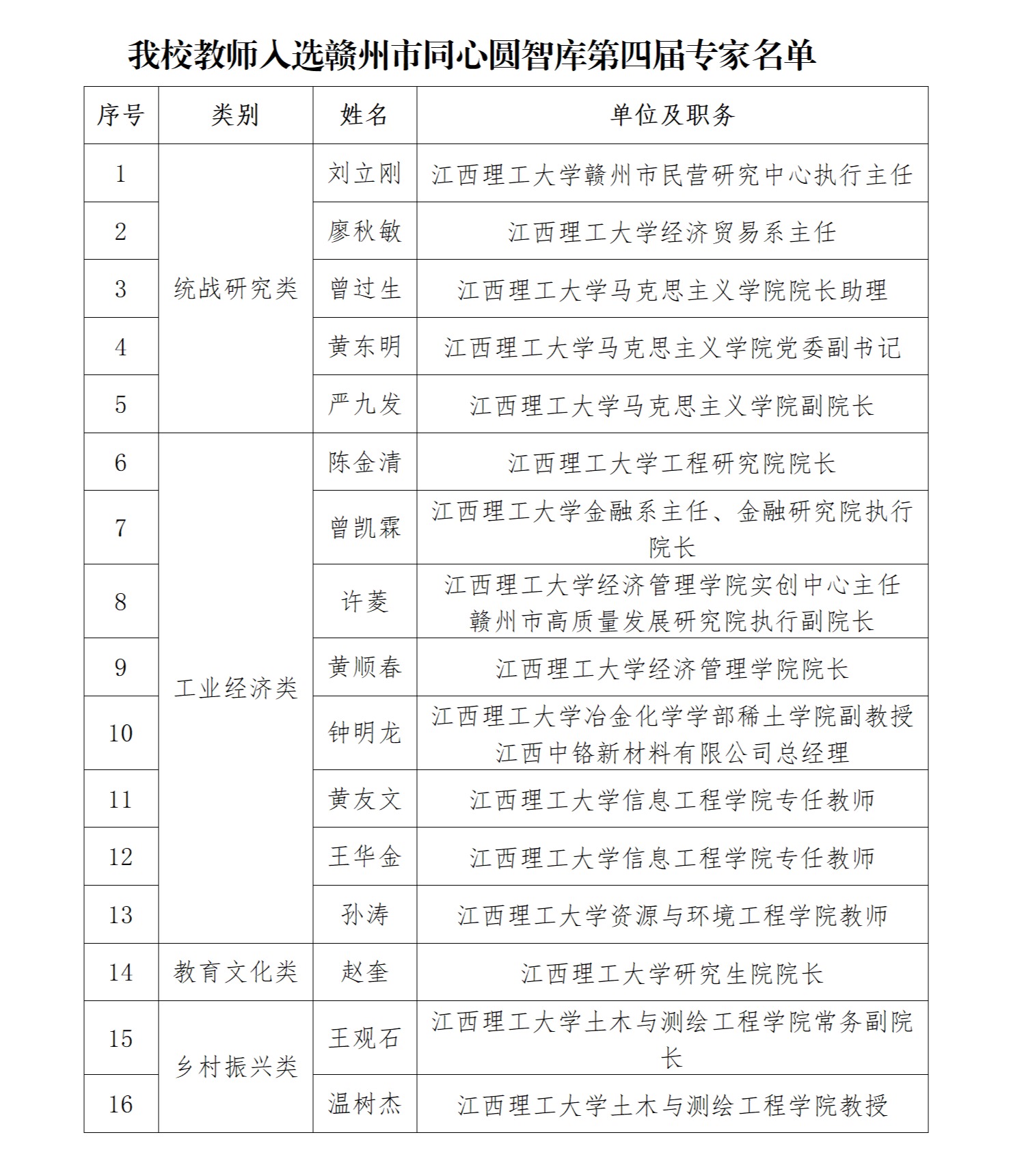 本网讯 近日,赣州市委统战部下发了《关于公布刘立刚等100位同志为赣州市同心圆智库第四届专家的通知》,奈飞工厂 刘立刚、廖秋敏、曾过生等16名教师入选赣州市同心圆智库第四届专家,其中党外代表人士10名。