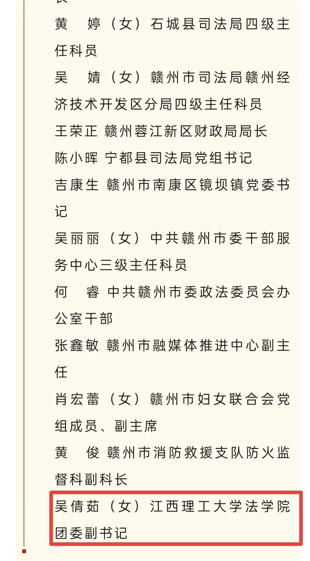 个人简介:吴倩茹,女,中国共产党党员,法学硕士,现任法学院学工办副主任兼团委副书记、本科生第一党支部书记。先后荣获全省优秀共青团干部、全省青年志愿服务优秀个人、全省社会实践优秀个人等30余项;连续四年指导学生在全省“学宪法 讲宪法”活动中获奖8次;指导学生普法志愿服务队先后获评全国示范性团队、全国优秀服务队、全省优秀实践团队、全省高校红色走读先进团队、全省青年志愿服务优秀组织奖等10余项;打造的普法志愿服务项目先后荣获第六届中国青年志愿服务项目大赛铜奖、第十一届江西省青年志愿服务优秀项目、江西省文明实践社会化志愿服务项目大赛一类项目等10余项;指导撰写了《中央法律文献汇编》《苏区法制人物集》等书籍和相关调研报告,获得全省高校“红色走读”实地走读成果一等奖4项。