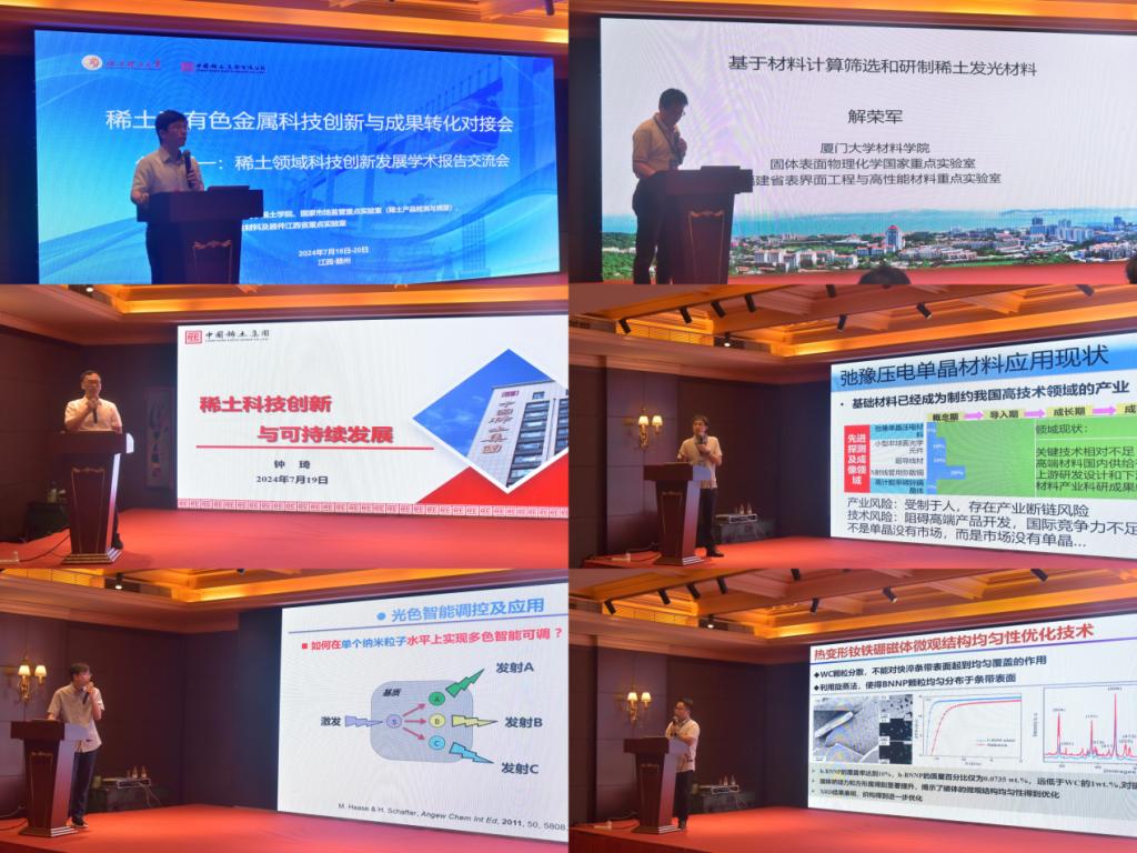 学术报告环节,会议围绕稀土分离提取、稀土发光材料、稀土磁性材料、稀土功能晶体、稀土催化材料、稀土元素分析检测等方向分享了近期研究成果并进行了深入的讨论。厦门大学材料学院院长解荣军教授、中国科学院赣江创新研究院莫兆军研究员、华南理工大学周博教授、中国稀土集团有限公司高工钟琦、中国科学院宁波材料技术与工程研究所高工唐旭等10余稀土领域知名专家,分别以“基于材料计算筛选和研制稀土发光材料”“稀土铕基低温/极低温磁制冷材料与技术”“多色上转换发光及应用”“稀土科技创新与可持续发展”“热变形钕铁硼磁体研究进展”等为题作报告。
