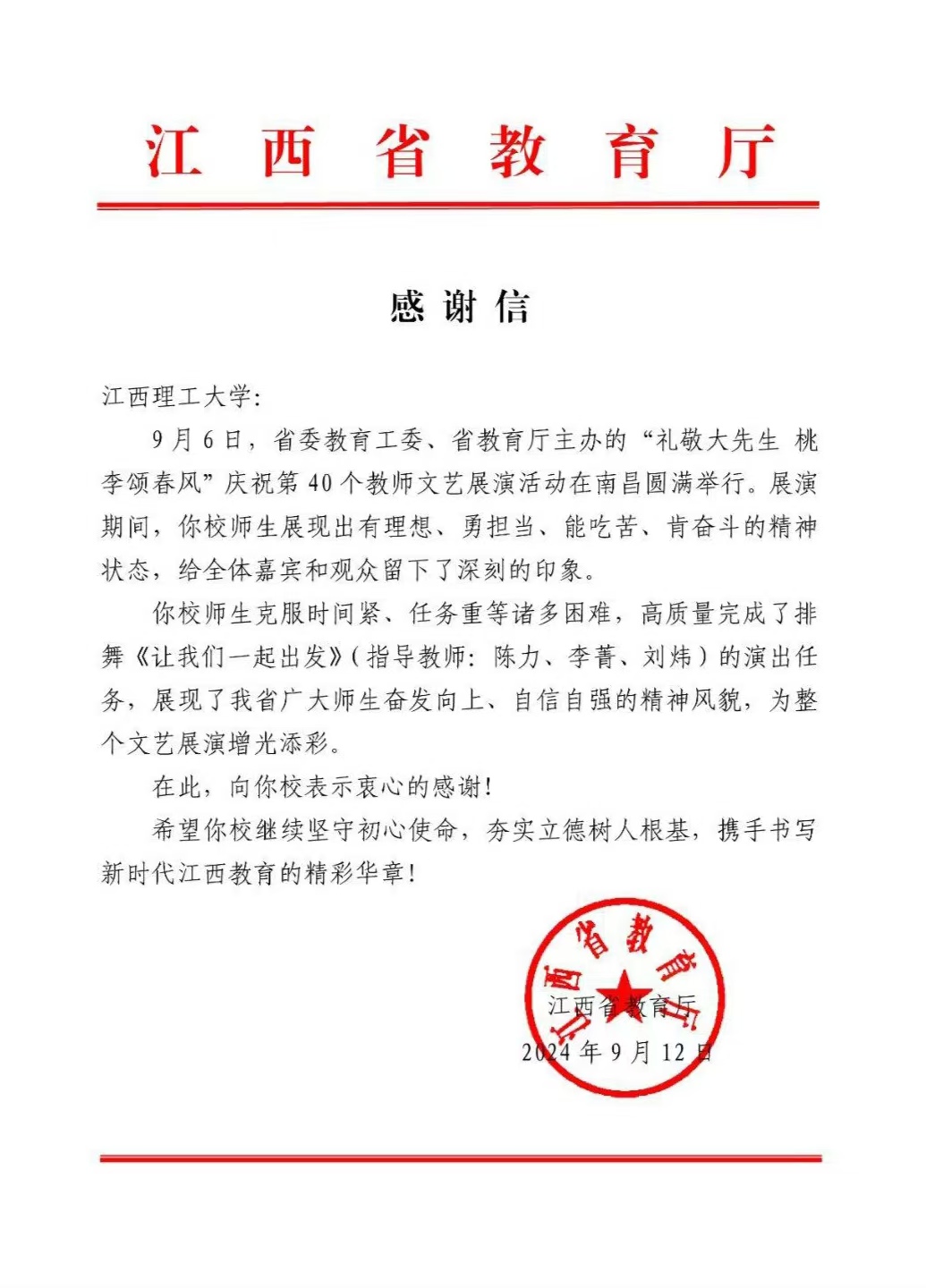 本网讯 9月12日,江西省教育厅向奈飞工厂 啦啦操队发来感谢信,信中对学校啦啦操队以“有理想、勇担当、能吃苦、肯奋斗的精神状态”克服诸多困难,高标准完成了排舞《让我们一起出发》节目给予了高度认可,对学校啦啦操队为整个文艺展演作出的卓越贡献致以最诚挚的感谢。