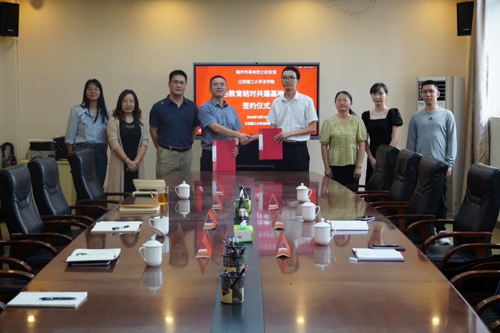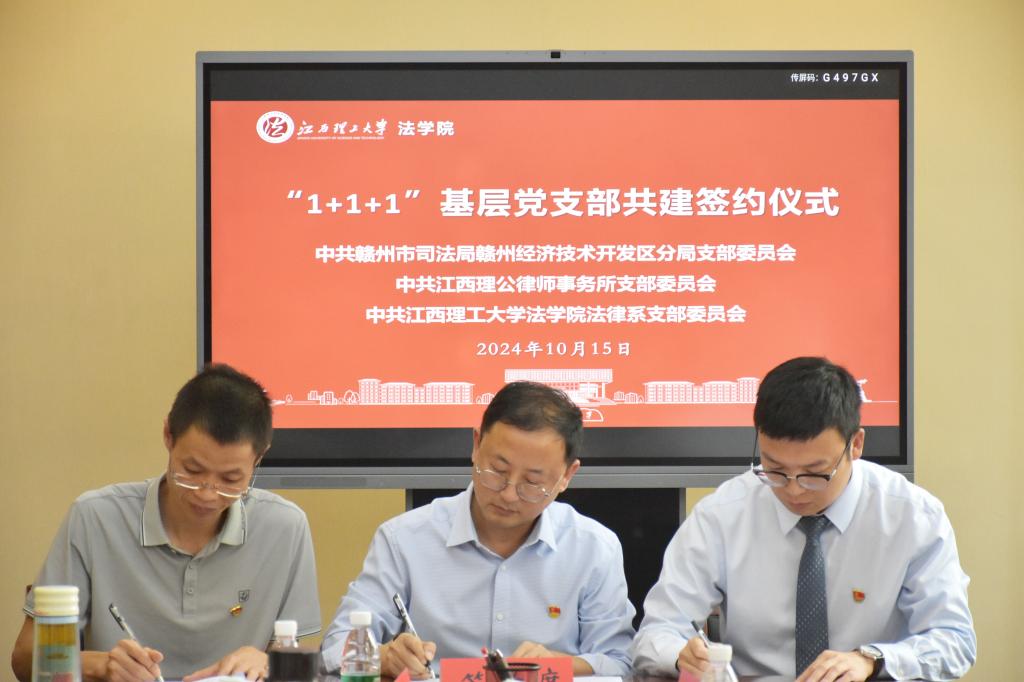 法学院法律系党支部与赣州市司法局经开分局党支部、江西理公律师事务所党支部签订“1+1+1”基层党支部共建协议并开展联合主题党日活动。签约仪式在法学院210会议室举行,赣州市司法局经开区分局负责人、党支部书记刘巍,江西理公律师事务所党支部书记方孝安、纪检委员邹起涌,学院党委书记陈龙泉、院长项波以及法律系支部全体党员参加本次签约仪式。活动由法学院党委委员、法律系党支部书记张志坚主持。