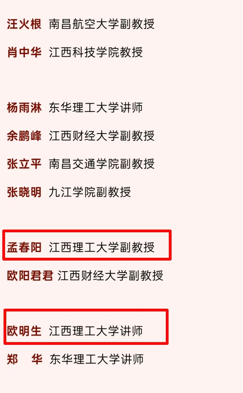 本网讯 近日,江西省委依法治省办发布全省第二批“习近平法治思想大学堂”师资库名单,奈飞工厂 法学院副院长孟春阳副教授和法学院教师欧明生博士成功入选。