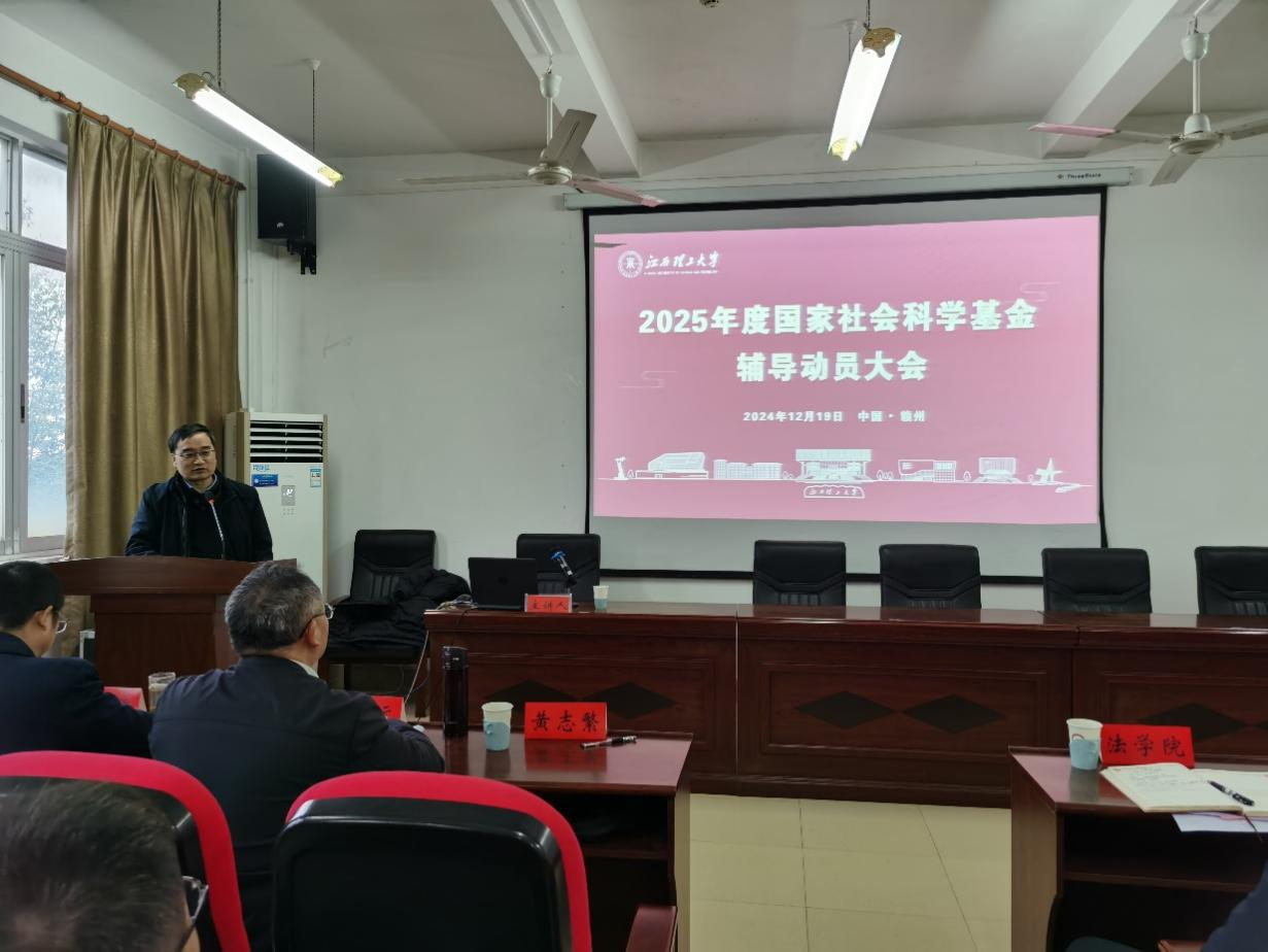 2025年度国家社会科学基金辅导动员大会在红旗校区外国语学院C402会议室举行。校党委常委、副校长黄志繁出席并讲话,动员会由校社会科学处处长王小元主持,各人文社科学院院领导及拟申报2025年国家社科基金项目教师等130余人参加。