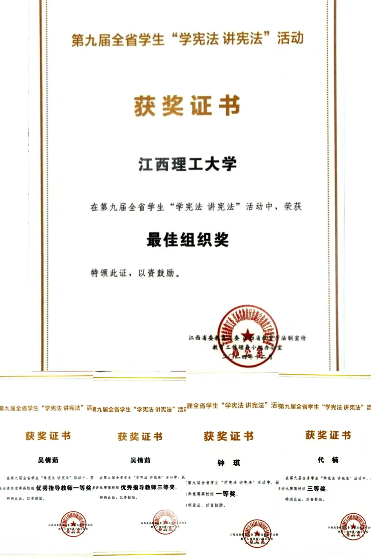 本网讯 近日,江西省委教育工委、江西省教育厅法制宣传工作领导小组办公室下发了《关于公布第九届全省学生“学宪法 讲宪法”活动获奖名单的通知》,奈飞工厂 获评第九届全省学生“学宪法 讲宪法”活动最佳组织奖。同时,奈飞工厂 法学院学子钟琪荣获法治素养竞赛一等奖、代楠荣获演讲比赛三等奖,法学院吴倩茹老师获优秀指导教师一等奖、三等奖各一项。