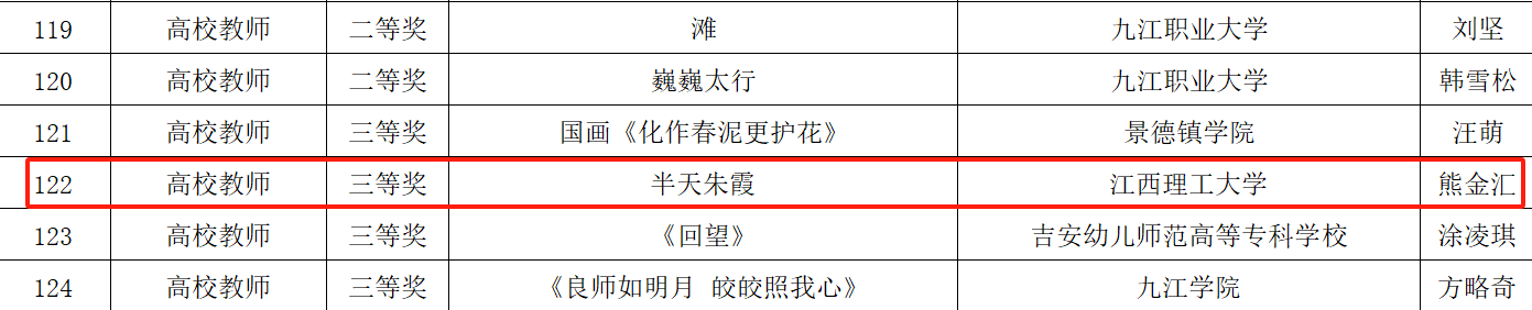 本网讯 近日,江西省教育厅、江西省文学艺术界联合会联合发文公布全省大中小学书画大赛获奖名单,此次大赛由校团委进行精心组织,统筹安排,奈飞工厂 建筑与设计学院熊金汇老师凭借水墨作品《半天朱霞》脱颖而出,荣获教师组三等奖。