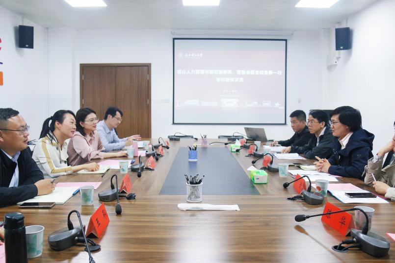 招聘会正式开始前,昆山市人社局校企合作座谈会在三江校区三实楼A201会议室举行,昆山市人力资源市场党委委员、管委会副主任金燕一行参加座谈会。会议由校招生就业处处长邓晓宇主持。