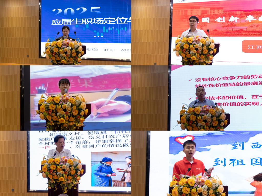 驻兴国县崇贤乡贺堂村第一书记兼工作队队长许立新、西部计划志愿者涂浩宇六位嘉宾分别以亲身经历从就业形势洞察、科技创新引领、基层服务实践、民营创业发展、西部计划奉献及奋斗精神传承等多元视角讲述了青年在基层沃土中拼搏奋斗、实现价值的动人故事,令在场学子深受触动。