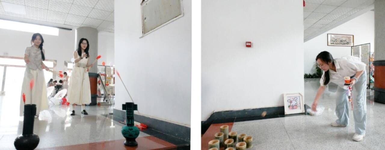 在互动游戏区,欢声笑语更是接连不断。此次才艺展将游戏环节分为了“乾坤一掷”的投壶环节和“灵珠入杯”的掷球环节。投壶场地前,同学们调整着姿势,全神贯注地将竹矢投出,只听“叮”的一声,竹矢正中壶心,欢呼声、赞叹声便交织在一起;掷球游戏区则充满现代活力,参与者们瞄准目标,精准投掷,有时球在竹筒沿转三圈后掉在地上,有时又会一发命中稳稳落在其中,但不管结果如何,同学们都在寓教于乐的游戏中感受着传统文化的魅力,体会着古礼今玩的雅趣和古今交融的欢腾,也增进了彼此间的交流与友谊。