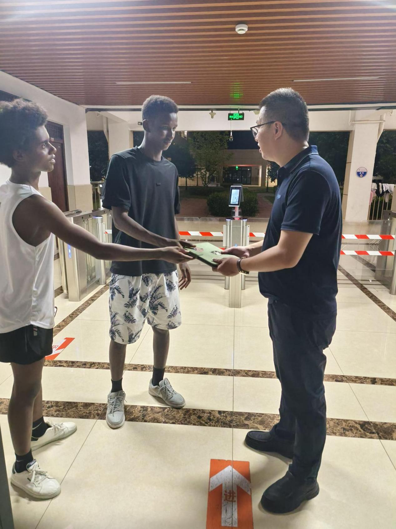 经济与管理学院2024级工商管理专业两名乍得籍国际学生——叶海亚和莫·阿里,在三江校区(东园)体育馆附近使用共享单车时,发现车筐内有一部遗失的iPad。两人商议后,在第一时间将设备交给了学校老师,并主动说明了情况。在国际教育学院和学工部多名领导和老师的协同调度下,关于iPad的失物信息通过辅导员在各学院班级群迅速扩散。当晚22点30分左右,iPad便顺利归还至失主手中。