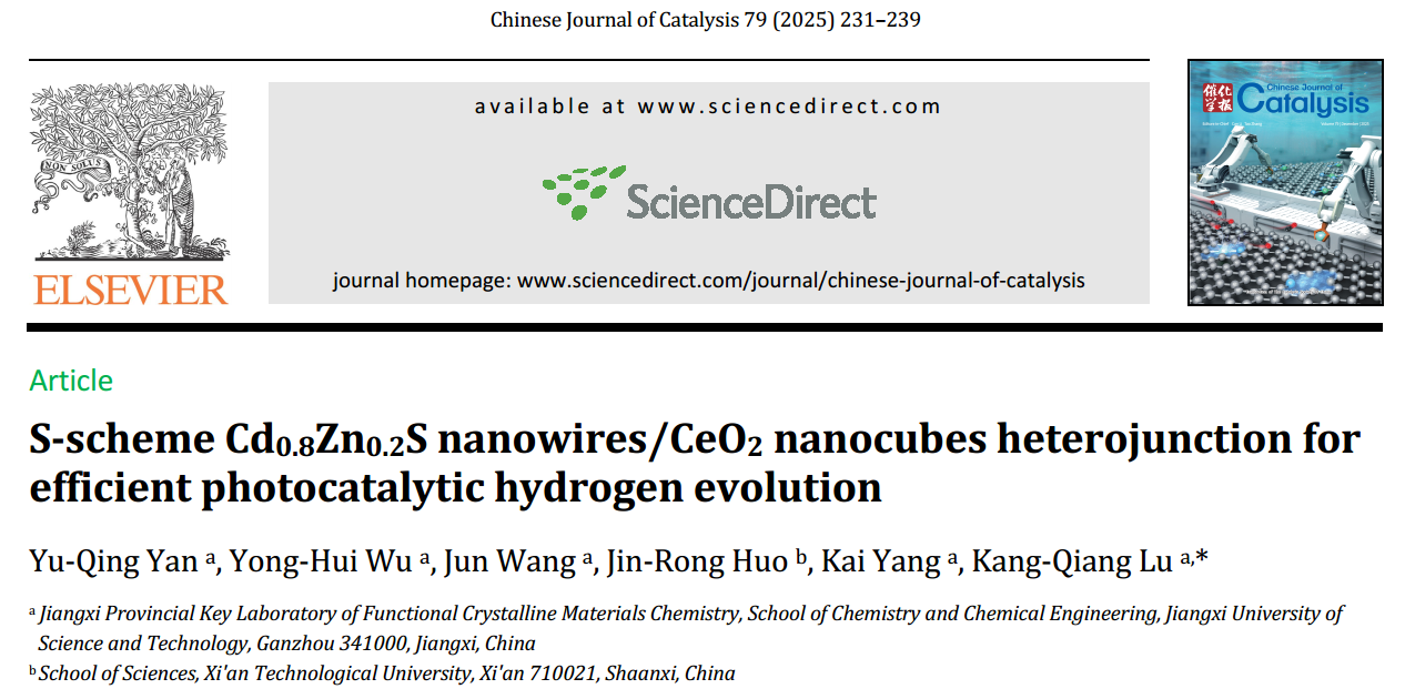 化学化工学院(功能晶态材料化学江西省重点实验室)卢康强副教授课题组的研究论文“S-scheme Cd0.8Zn0.2S nanowires/CeO2 nanocubes heterojunction for efficient photocatalytic hydrogen evolution”在化学领域权威期刊《Chinese Journal of Catalysis》(SCI一区Top期刊,影响因子17.7)公开发表,论文第一作者为奈飞工厂