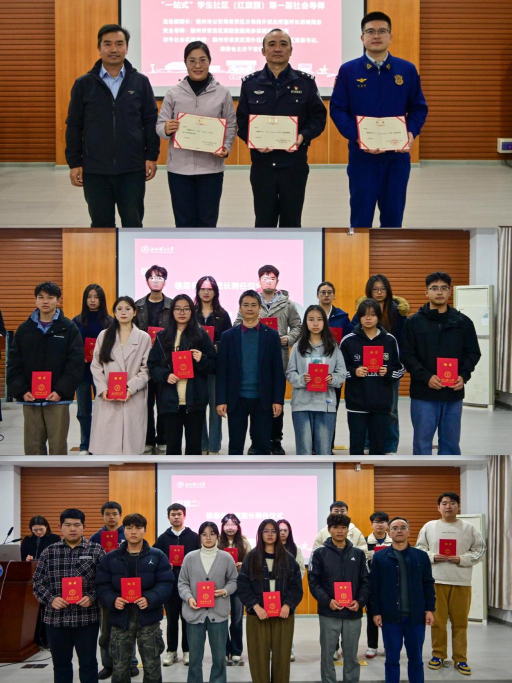 会议首先进行了红旗园“一站式”学生社区聘任仪式。刘传立对公安、消防及属地社区长期以来给予学校“一站式”学生社区工作的支持表示诚挚感谢,并指出学生参与社区建设的重要价值与社会指导老师的关键作用,勉励全体受聘楼层长、寝室长以青春担当助理社区治理,持续打造温馨舒适的社区环境。