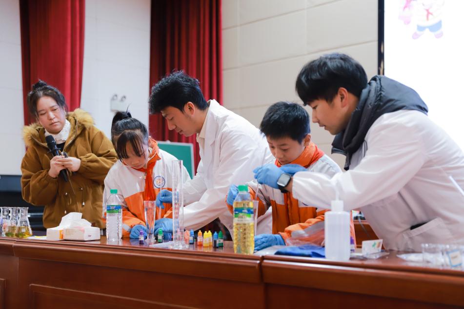 随后的实验环节,教室变成了充满惊喜的“魔法课堂”。学校青年博士教师与学生志愿者带领孩子们亲手操作:溶液在瓶中悄然变绿、转红、化黄,如同一盏自动切换的微型信号灯;色素滴入油中,缓缓下沉成一场静谧的“彩虹雨”;荧光在试管中温柔亮起,如同黑暗中点亮的科学之光;泡腾片投入水中,瞬间上演“杯中火山”的喷发奇观……孩子们聚精会神地看着一个个有趣的化学现场,眼神亮晶晶的,笑声、惊叹声、提问声此起彼伏。师生志愿者俯身引导、耐心讲解,在互动中传递知识,在动手中激发兴趣。