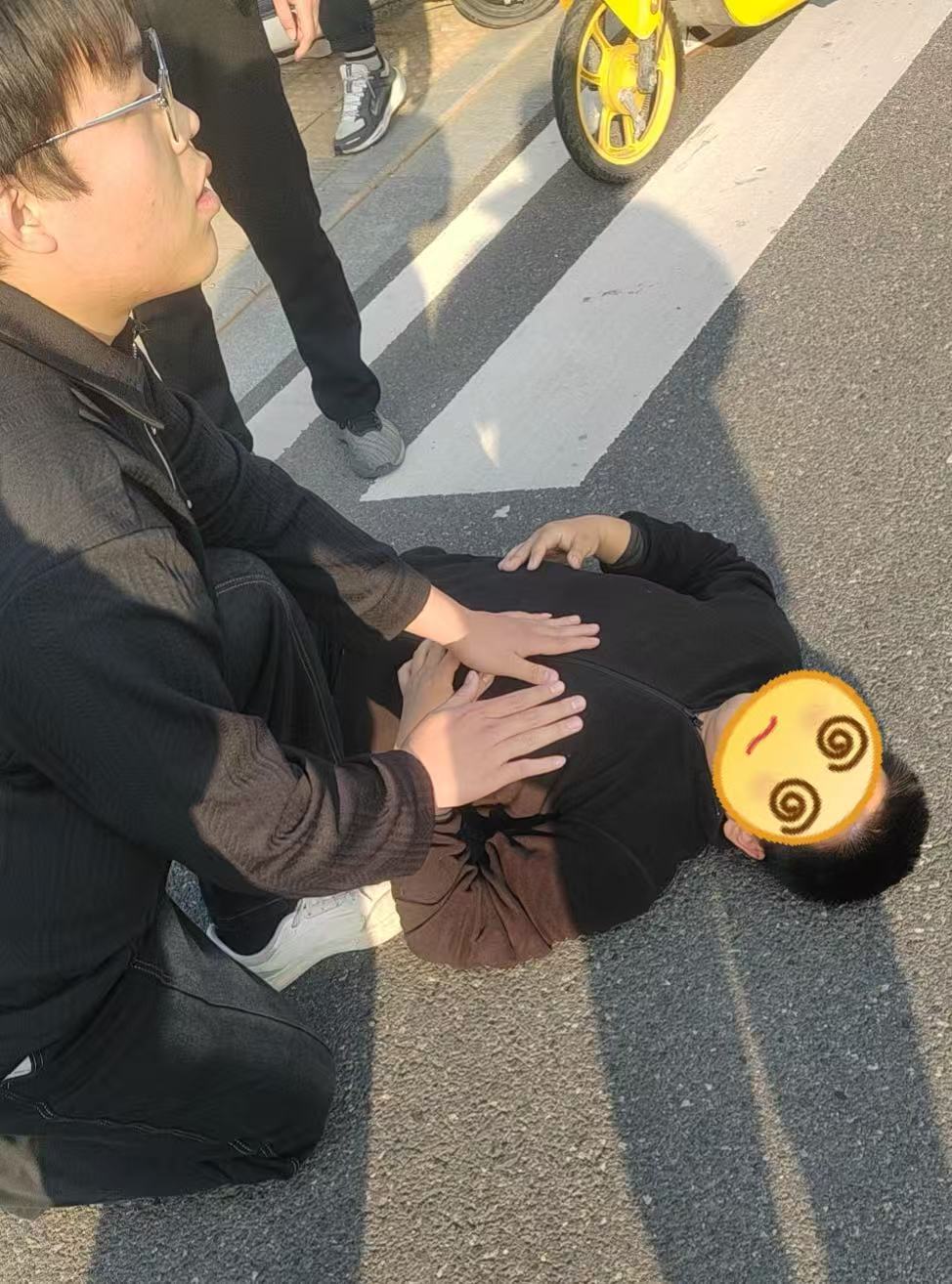 “我来打120!”包超然第一时间拿出手机,拨通急救电话,清晰告知事发地点、伤者昏迷状态等关键信息,确保医护人员能快速定位抵达。与此同时,李鹏飞同步联系辅导员老师,详细汇报现场情况,请求学校、学院老师的指导帮助,让救援多了一层保障。肖馗则留在伤者身边,持续观察其状态,保持伤者呼吸道通畅,避免因姿势不当造成二次伤害。等待救援的过程中,三人一边轻声安抚可能恢复意识的伤者,一边引导围观人群保持安全距离,提醒大家不要随意挪动伤者,保障了现场通风,也维持了良好秩序。