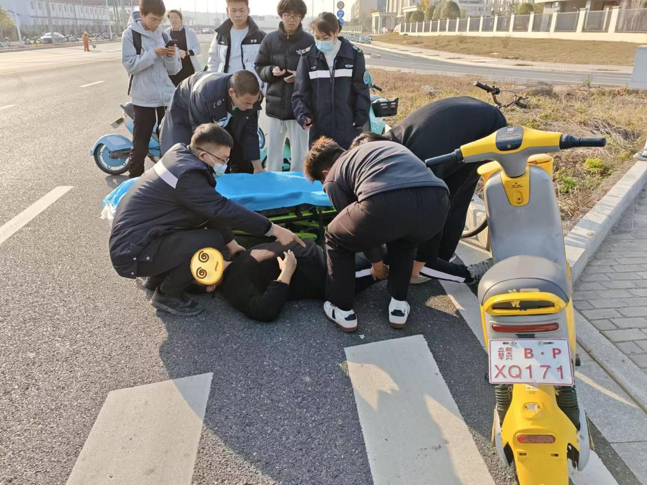 当日下午,包超然、肖馗、李鹏飞三人结伴前往三江校区东园图书馆借阅资料,行至半路时,突然发现前方不远处有一名路人躺地不起。“有人晕倒了!”三人没有丝毫犹豫,立刻快步上前查看情况,在发现倒地路人双眼紧闭、意识不清,后脑有摔倒痕迹,情况十分危急后。凭借日常学习中掌握的应急救援常识,三人首先确认现场环境安全,随后轻声呼唤伤者并轻拍其肩部,观察是否有回应。在确认伤者无明显意识后,三人没有慌乱,迅速达成救援共识,一场与时间赛跑的紧急救助随即展开。